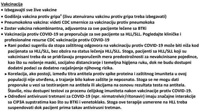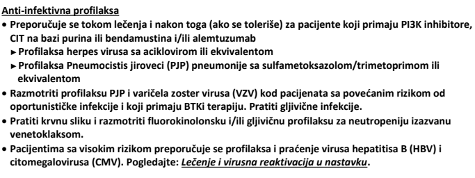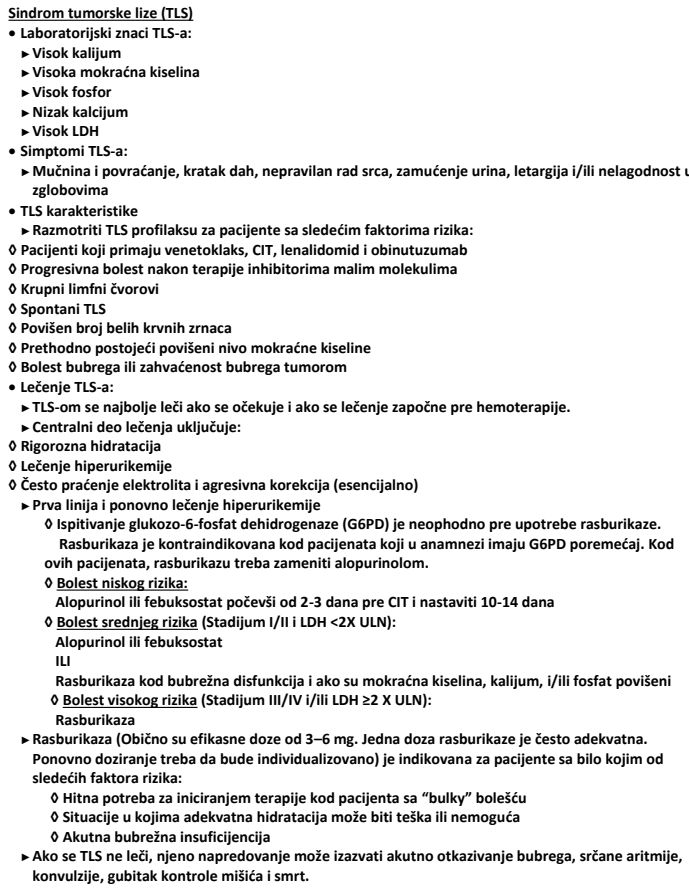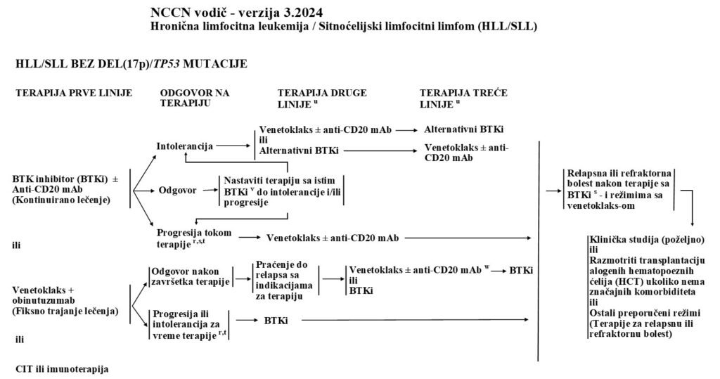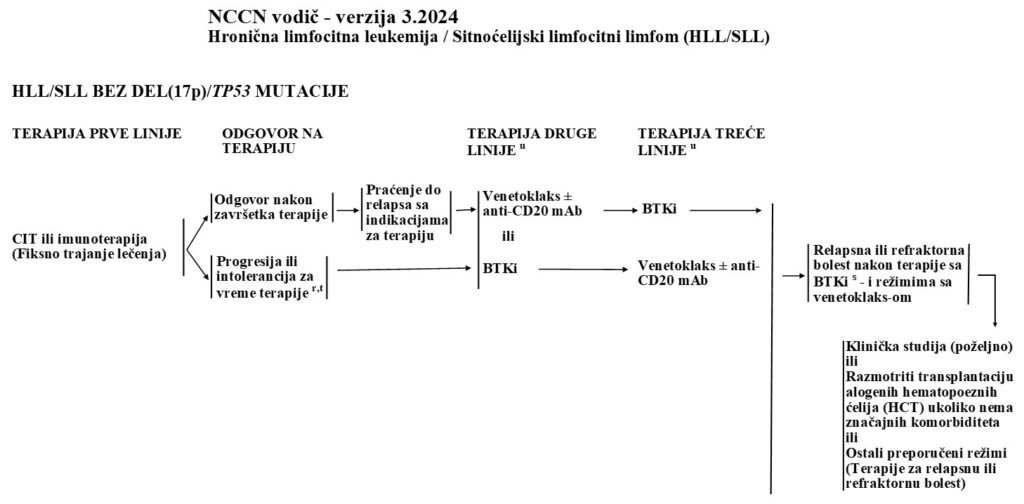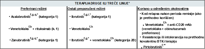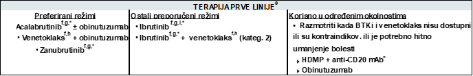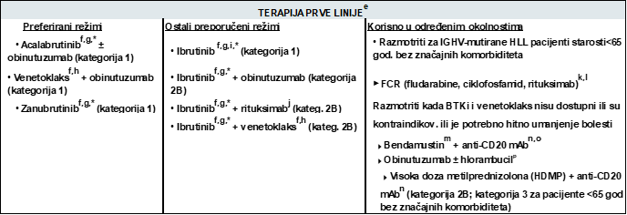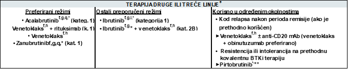 Izvor: Wierda WG, Brown J, Abramson JS, Awan F, Bilgrami SF, Bociek G, Brander D, Cortese M, Cripe L, Davis RS, Eradat H, Fakhri B, Fletcher CD, Gaballa S, Hamid MS, Hill B, Kaesberg P, Kahl B, Kamdar M, Kipps TJ, Ma S, Mosse C, Nakhoda S, Parikh S, Schorr A, Schuster S, Seshadri M, Siddiqi T, Stephens DM, Thompson M, Ujjani C, Valdez R, Wagner-Johnston N, Woyach JA, Sundar H, Dwyer M. Chronic Lymphocytic Leukemia/Small Lymphocytic Lymphoma, Version 2.2024, NCCN Clinical Practice Guidelines in Oncology. J Natl Compr Canc Netw. 2024 Apr;22(3):175-204. doi: 10.6004/jnccn.2024.0018. PMID: 38626800.