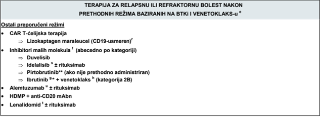 u Kod pacijenata sa bolešću koja reaguje na terapiju: Nastaviti sa istim BTKi do progresije i/ili intolerancije. Ako se leči tretmanom sa fiksnim trajanjem na bazi venetoklaksa, pratiti do relapsa sa indikacijama za ponovno lečenje. U vreme progresije bolesti, preći na sledeću terapiju što je pre moguće. Interval bez terapije treba da bude što kraći. Bezbedno je preklapati se sa venetoklaksom dok traje BTKi terapija.