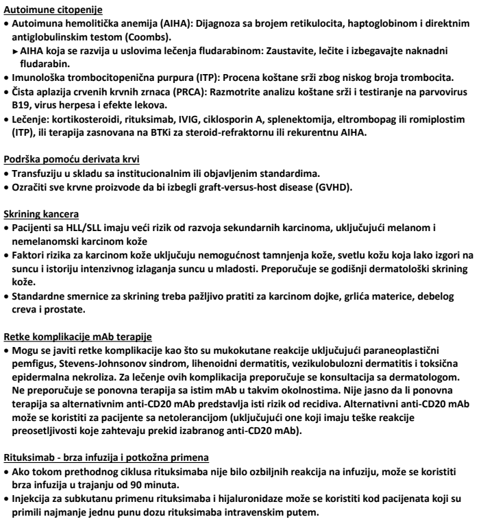 d Ponovno davanje istog mAb se ne preporučuje kod pacijenata koji imaju retke komplikacije (npr. mukokutane reakcije uključujući paraneoplastični pemfigus, Stevens-Johnsonov sindrom, lihenoidni dermatitis, vezikulobulozni dermatitis i toksičnu epidermalnu nekrolizu). Nije jasno da li ponovno davanje alternativnog anti-CD20 mAbs predstavlja isti rizik od recidiva.