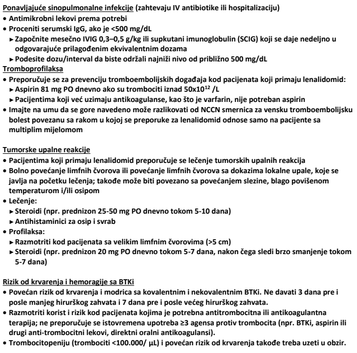 t Lenalidomid se može davati kroz kontinuirano ili povremeno doziranje za pacijente sa HLL. Faktori rasta i/ili prilagođavanje doze mogu biti potrebni za rešavanje citopenije, bez potrebe za zaustavljanjem lečenja. Videti Andritsos L, et al. J Clin Oncol 2008;26:2519-2525; Vendtner C, et al. Leuk Limphoma 2016; 57: 1291-1299.